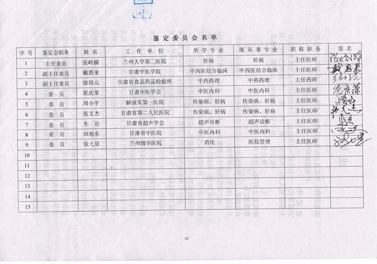 本次鉴定会由省科技厅组织,兰州市科技局主持,省肝病学会主任委员张岭漪、省中医学院中西医结合专业戴恩来教授、省食品药品检验所专家徐培元主任、省中医药管理局副局长,中医内科专家崔庆荣、解放军第一医院肝病科主任周小平、省二院肝病科主任张文杰、兰大二院超声诊断专家车岩、省中医院消化科主任田旭东、兰州锦华医院消化科专家张七星9位专家组成鉴定委员会。