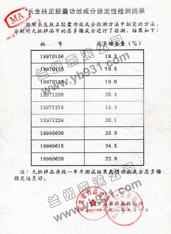 该实验是对燕滨扶正胶囊中,主要成分总多糖含量及药效稳定性的实验结果进行了报告。(申报初期暂起名为长生扶正胶囊,批准时更名为燕滨扶正胶囊)