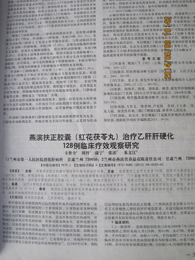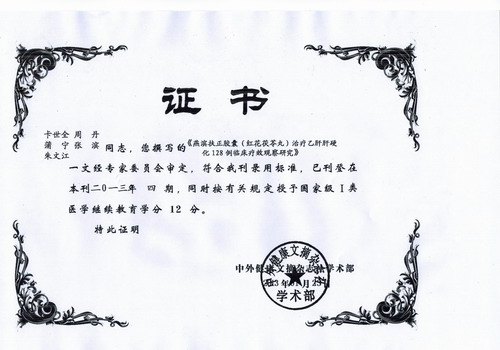 燕滨胶囊发表于国家中药管理局核心期刊证书