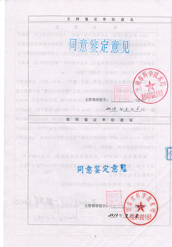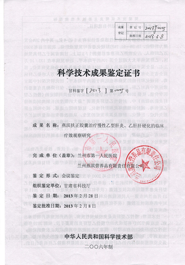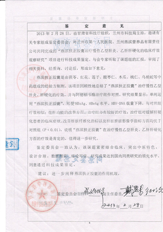 鉴定意见:2013年2月28日,由甘肃省科技厅组织,兰州市科技局主持,邀请有关专家组成鉴定委员会,对兰州市第一人民医院、兰州燕滨生物科技公司共同完成的“燕滨扶正胶囊”治疗慢性乙型肝炎、乙肝肝硬化的临床疗效观察研究” 项目进行科技成果鉴定。与会专家听取了课题组的汇报,审阅了相关资料,经质询、讨论后,形成如下意见: